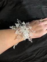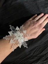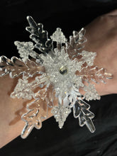 Acrylic snow/frosted sparkling snowflake approx 4 inches wide with silver ribbon wrist ribbon tie.