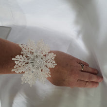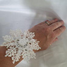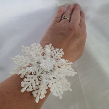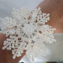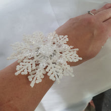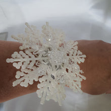 White snow/frosted sparkling snowflake approx 4 inches wide with silver or white ribbon wrist ribbon tie.