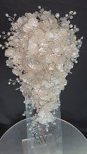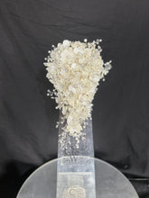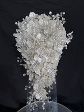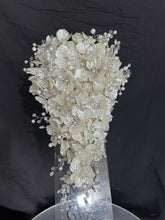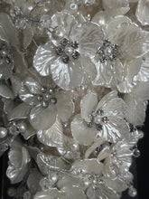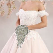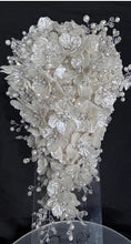 The bouquet has a pearl and Silver crystal wrapped handle and ivory base trim in satin,