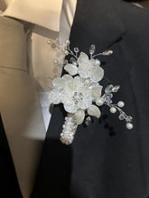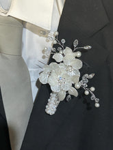 The boutionerre is made with superior Swarovski elements, premium-quality glass crystals with beautiful ivory pearlised resin flowers and vine leaves.