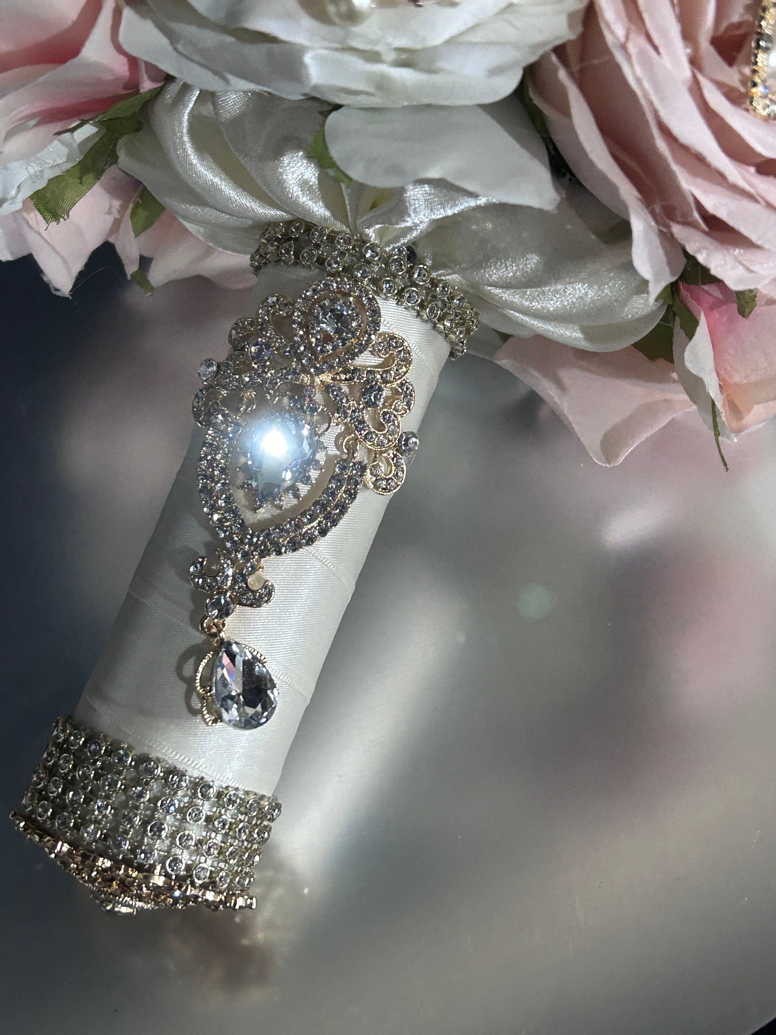 Vintage English garden rose-style bouquet with ivory satin, & rhinestones and pearls
