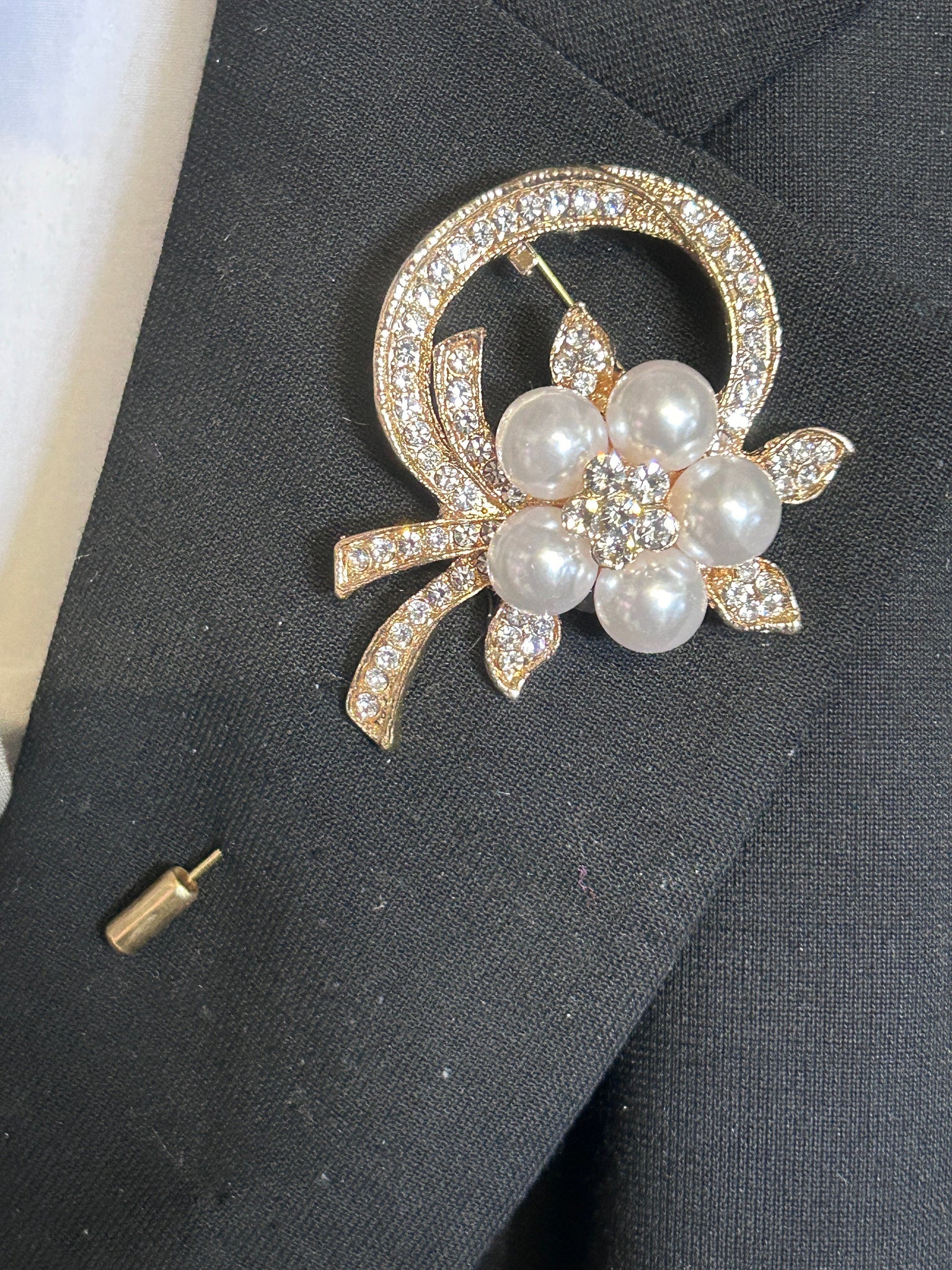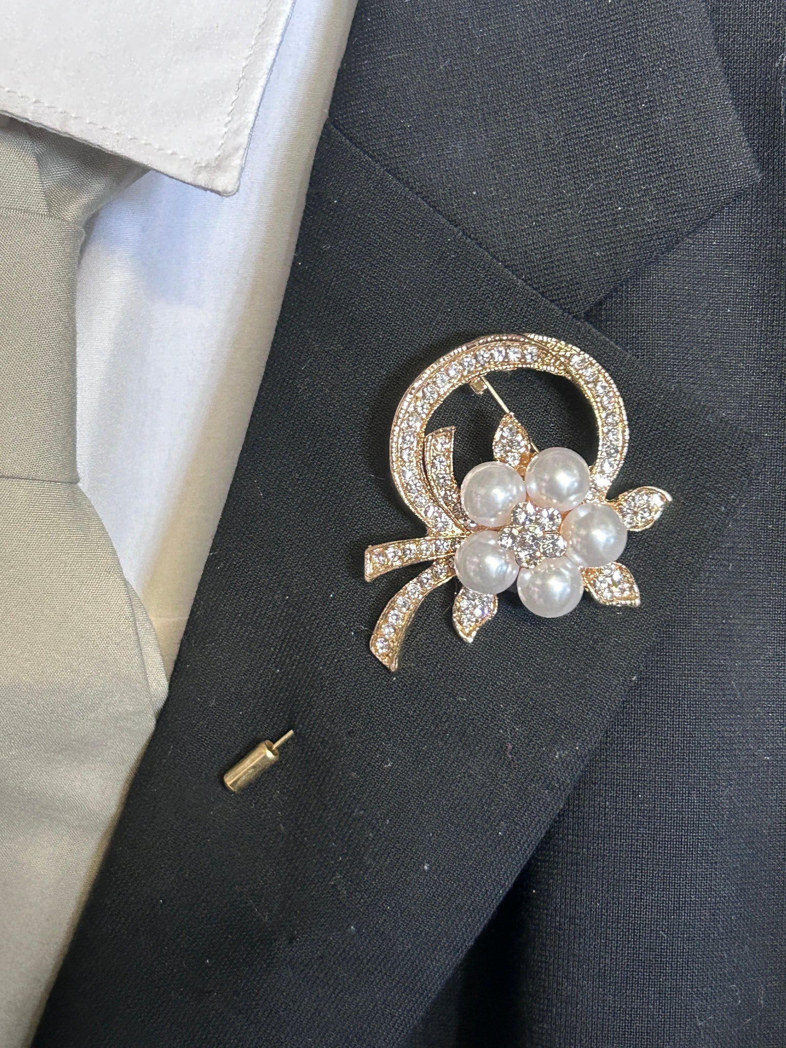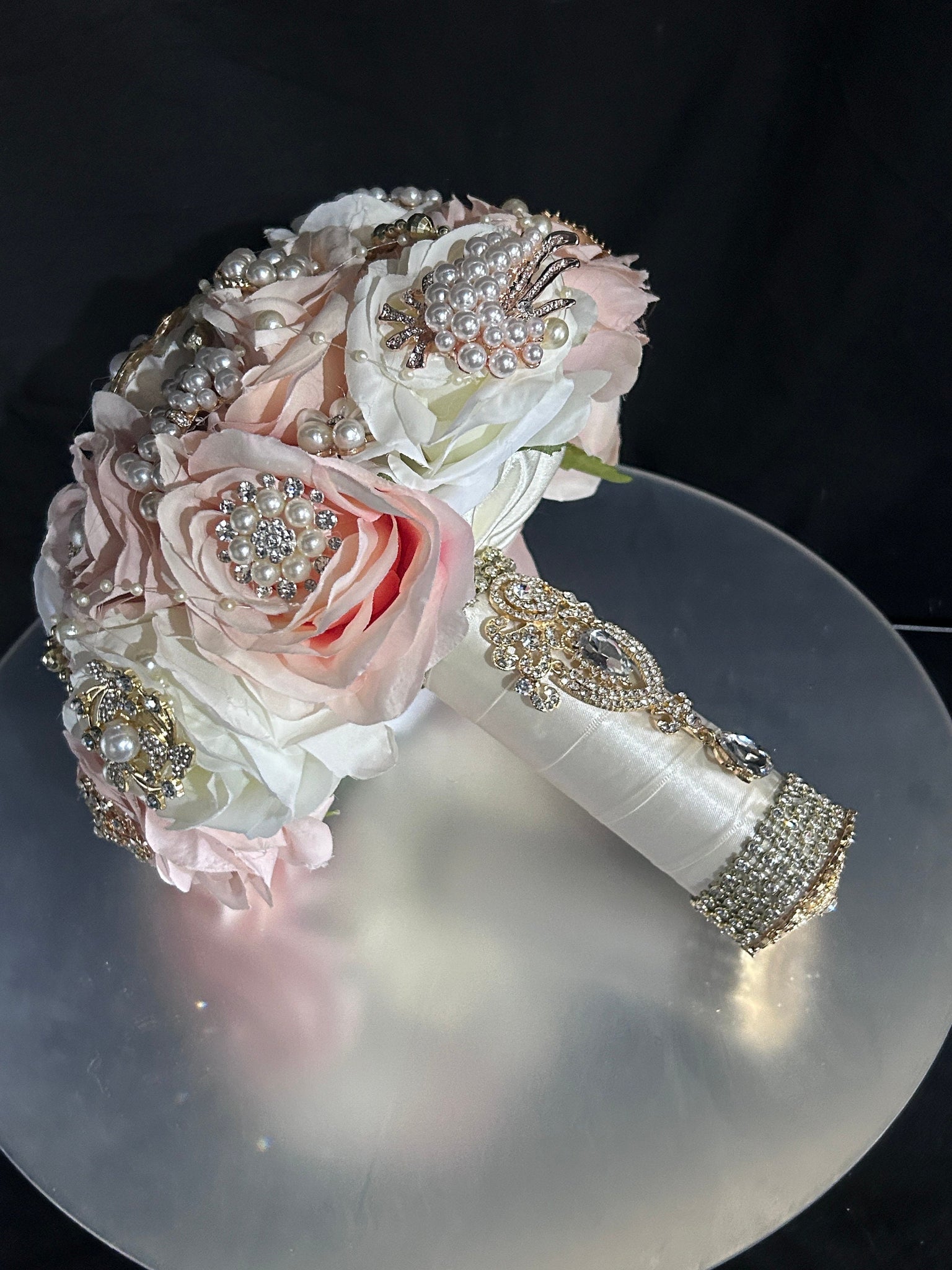 Covered in pearl and rhinestone crystal brooches in a selection of gold-tone and rose gold-tone mixed brooches are used, and matching groom buttonhole to match can be purchased separately