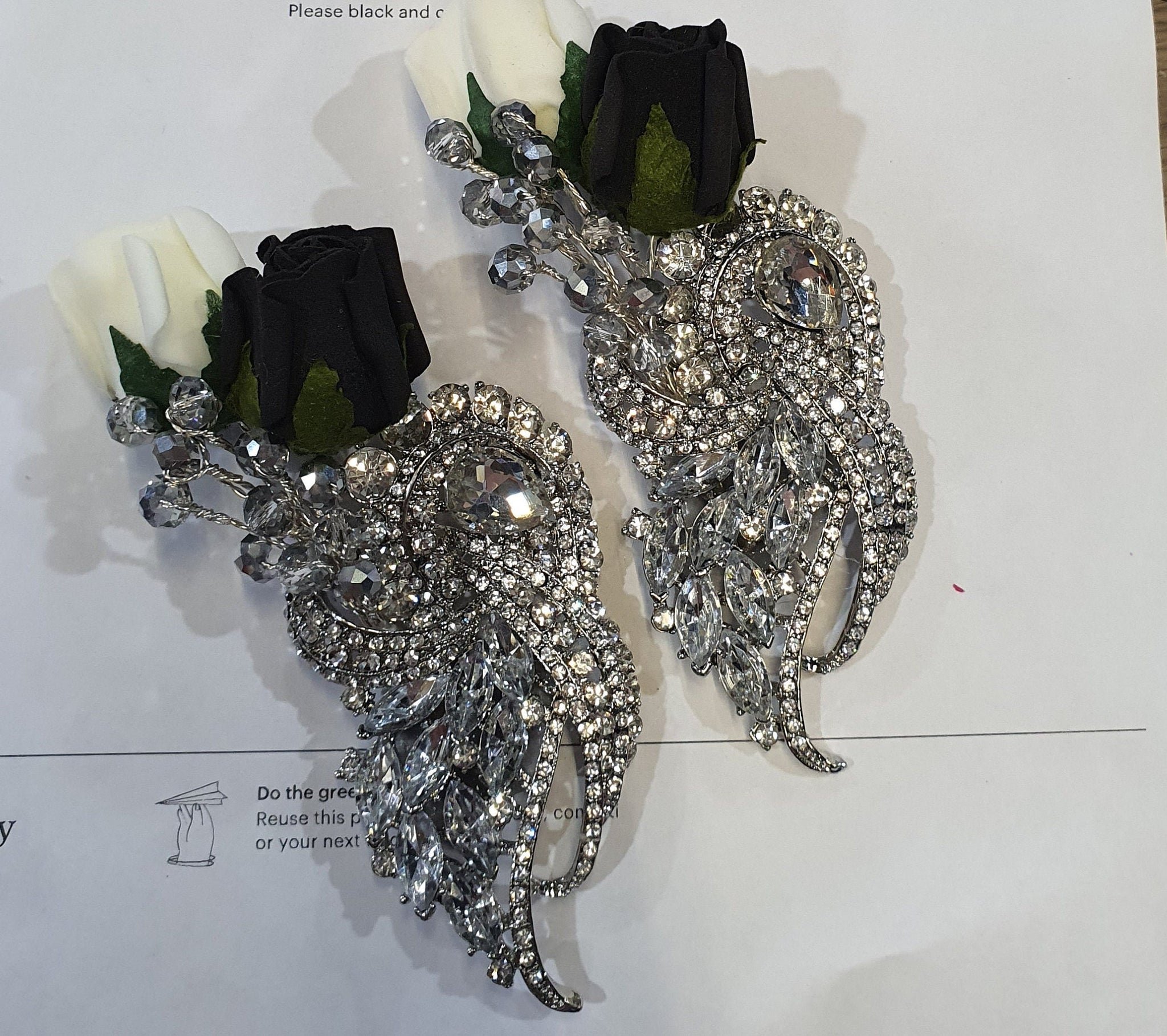 • Load image into Gallery viewer, Crystal brooch buttonhole with ivory and black foam roses by Crystal wedding uk