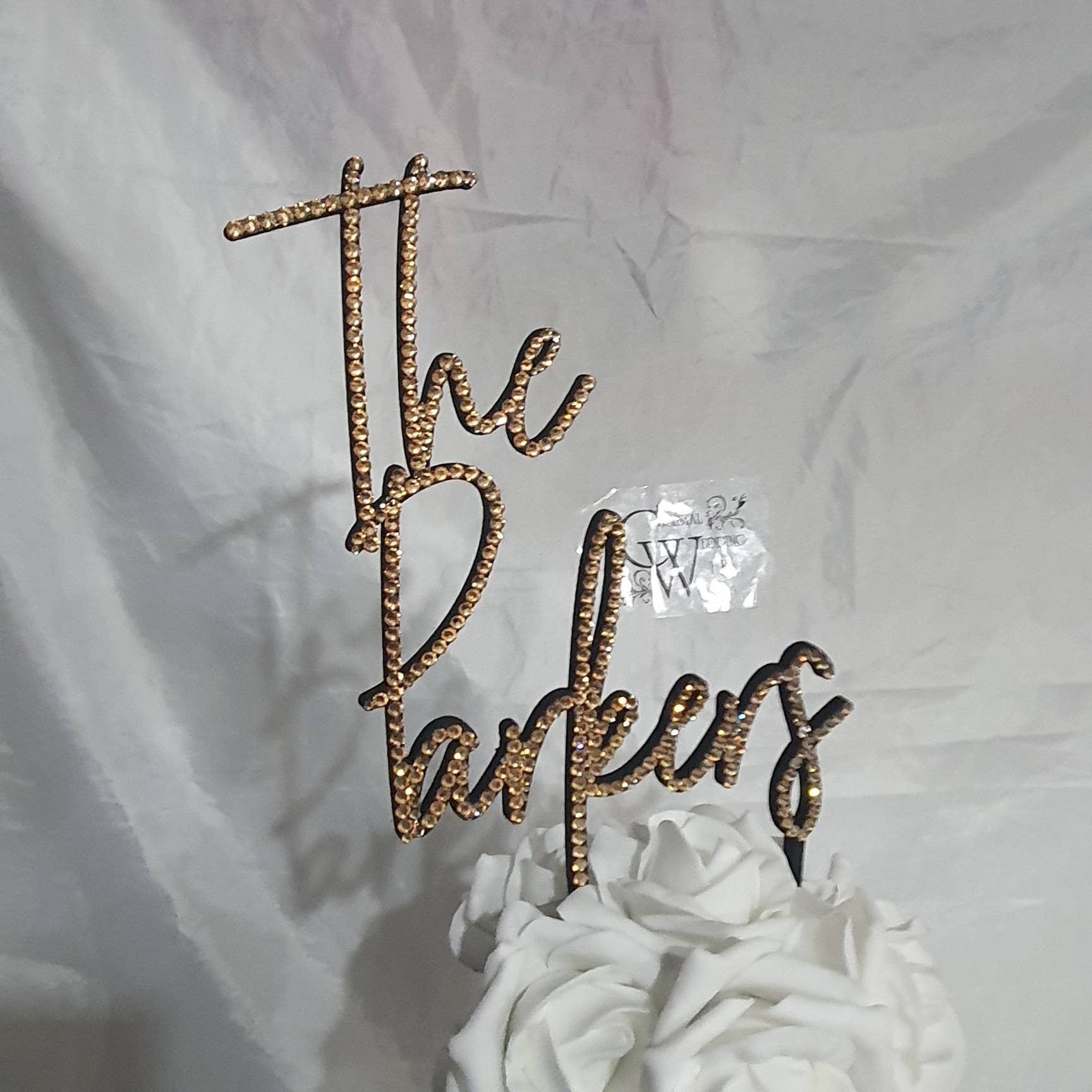 This beautiful golden crystal surname topper are embellished with golden shadow Swarovski elements rhinestone crystals on an acrylic laser cut base, we can also use faux pearls or crystals.