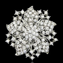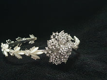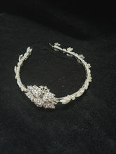 A metal headband embellishment with pearl and crystal rhinestone trim and a vintage rhinestone brooch