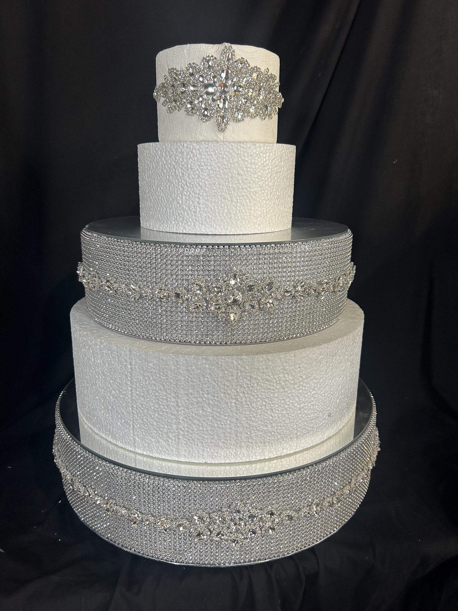 This beautiful real crystal rhinestone adorned this cake stand that will give a beautiful accent to display your wedding or other celebration cakes