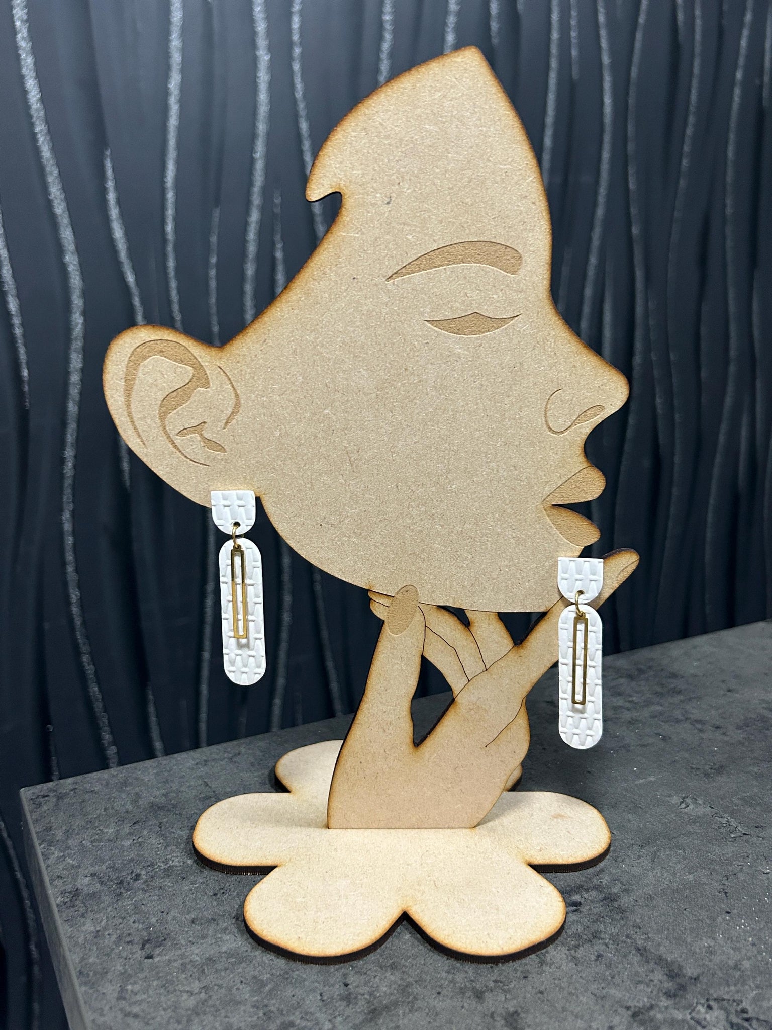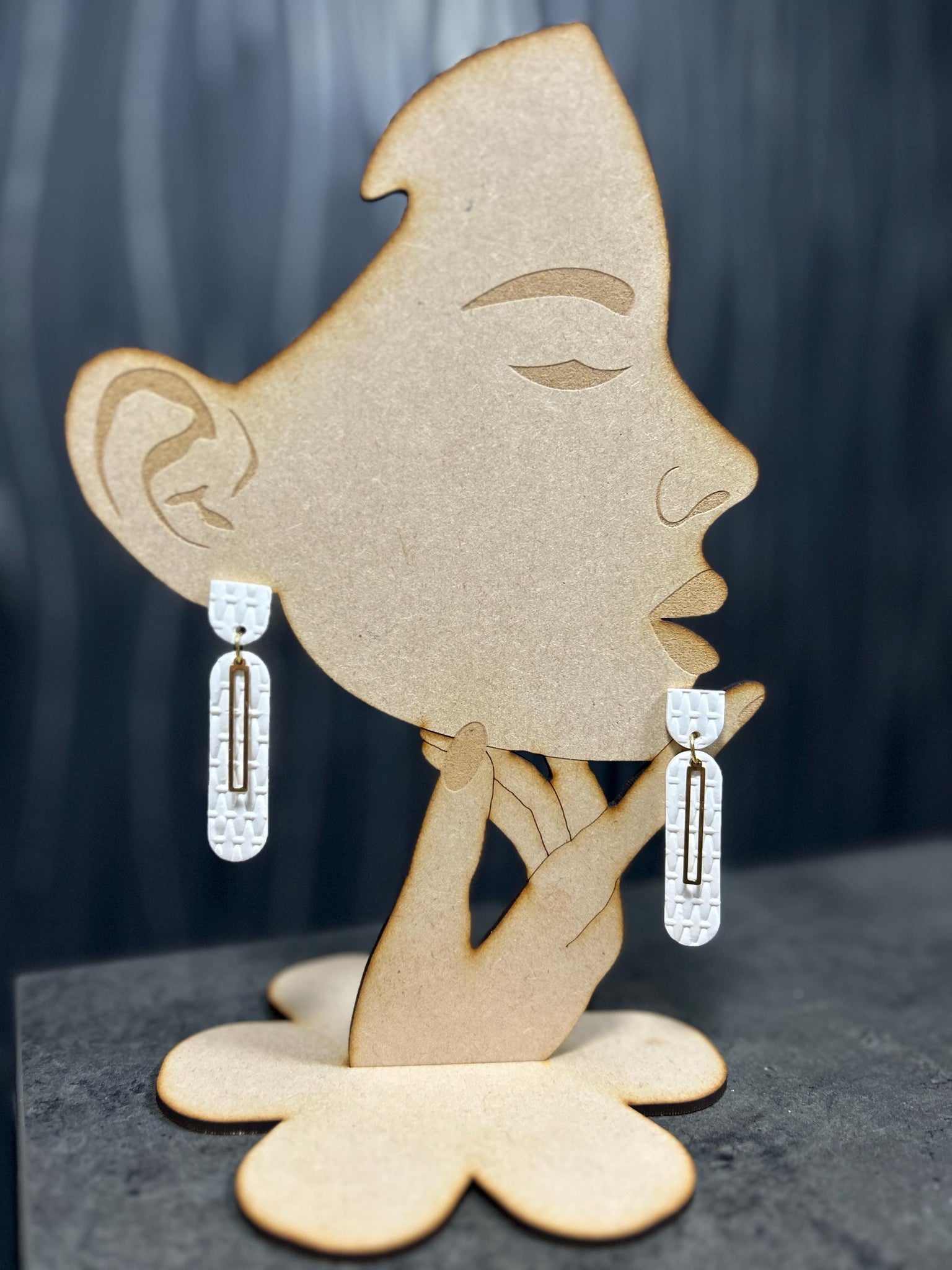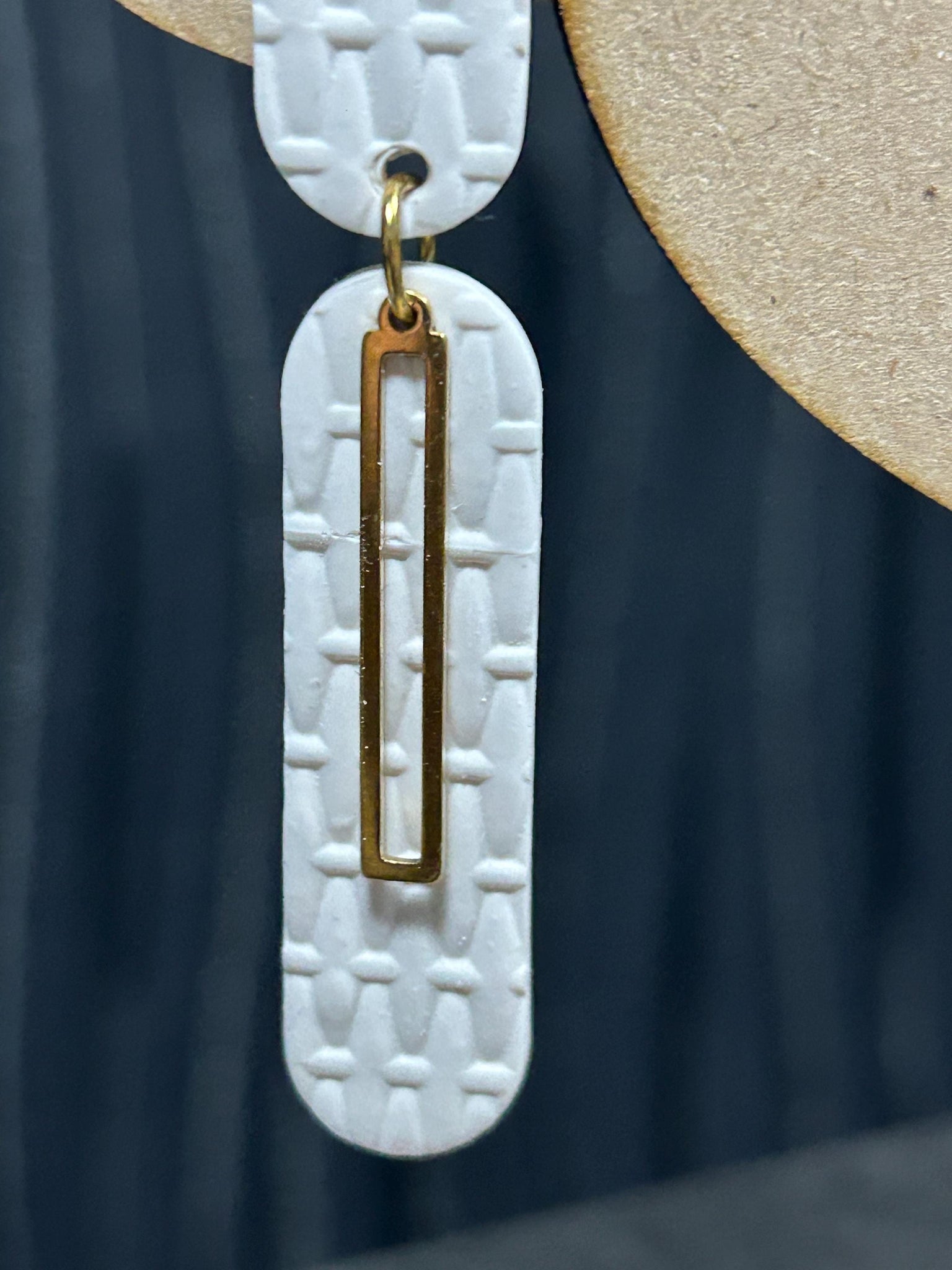 These handmade white minimalist rectangle earrings are carefully shaped from fine polymer clay into modern, striking textured finished a metal long dangle element for a touch of interest .