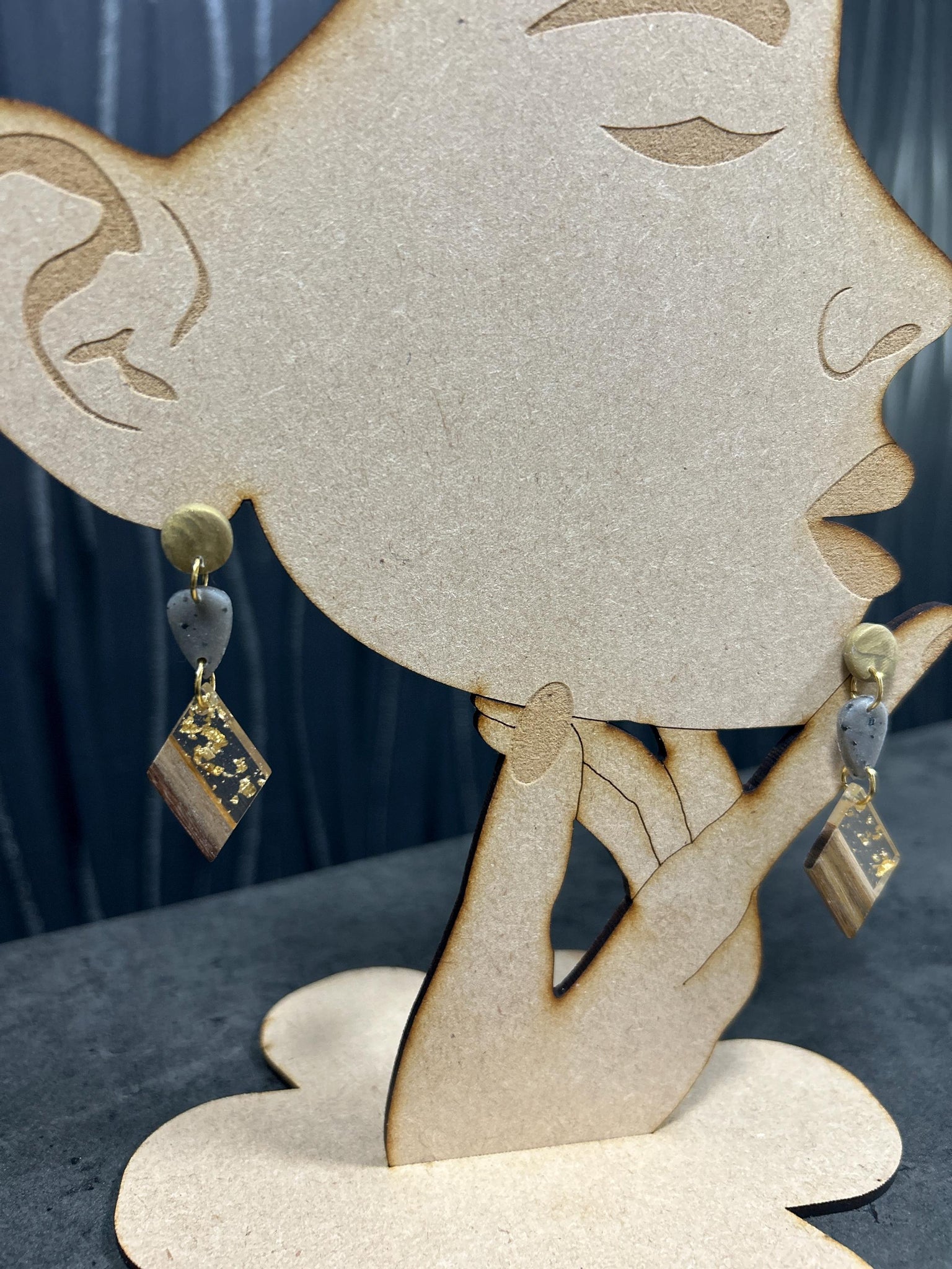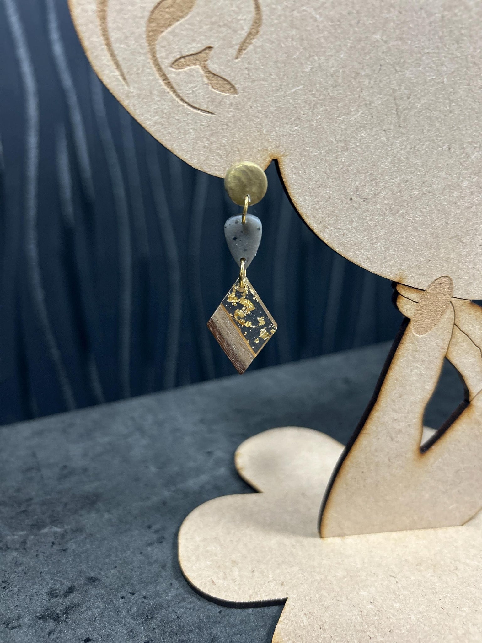Modern Clay Earrings, Delicate white Resin, Wood, metal and Clay Abstract Earrings –Boho Statement Polymer Clay Dangle Earrings